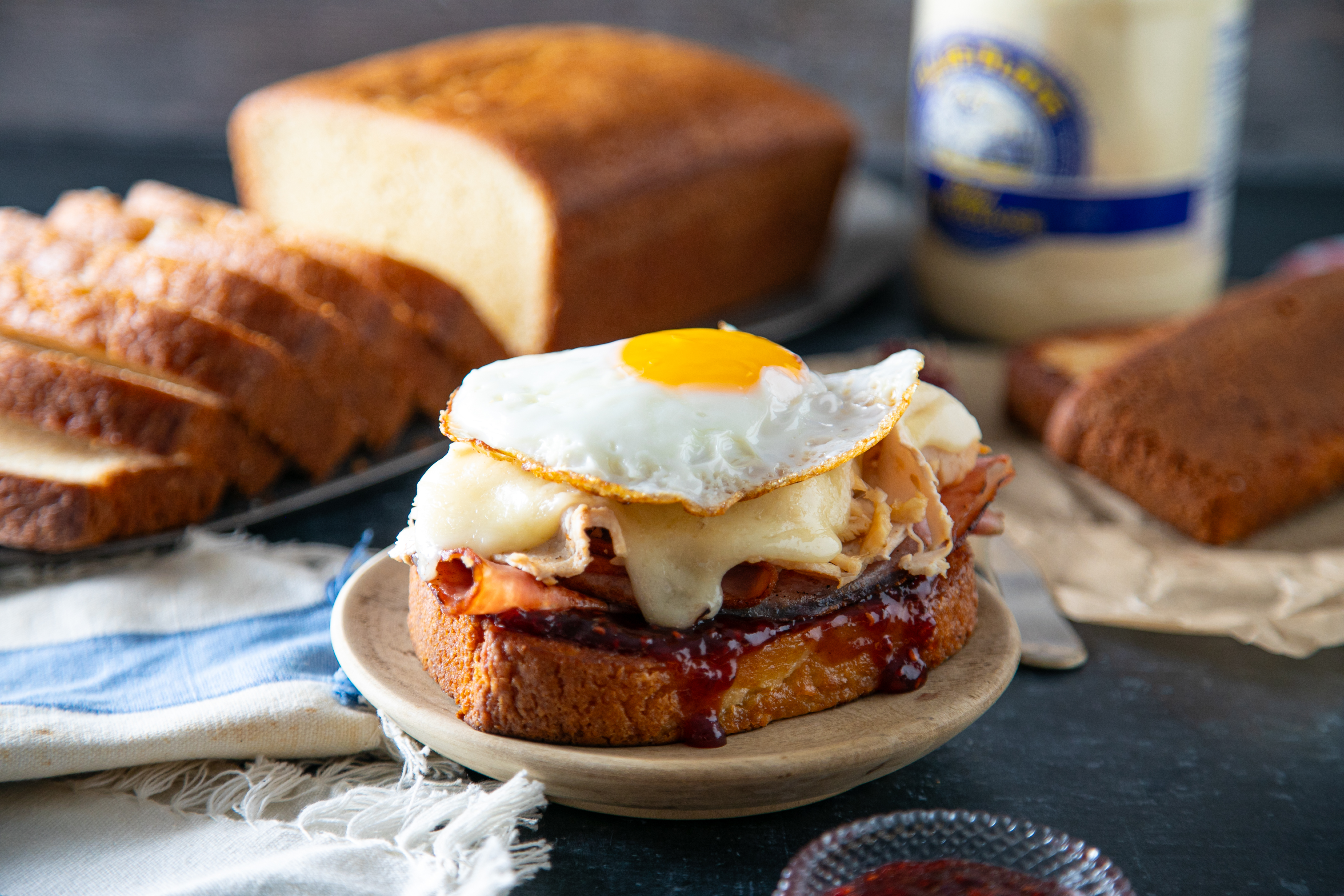 A little sweet, a little savory, and downright delicious for breakfast, brunch or even lunch, this Monte Cristo open-faced sandwich is made with with a thick slice of pound cake, fried until crispy and golden, and layered with berry jam, salty ham, turkey, Swiss cheese and a fried egg. Now that’s the good stuff!