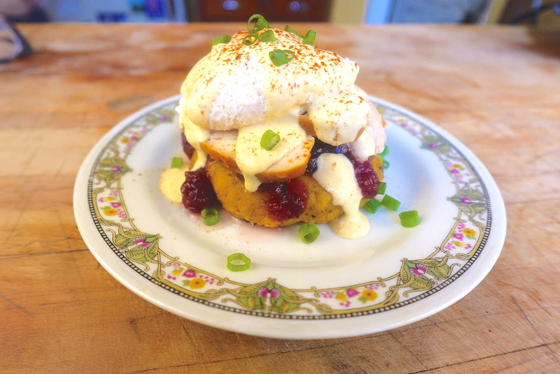 The weekend after Thanksgiving is ahead, and you’ve got family and guests to feed – and a fridge full of leftovers. Introducing the Bénédicte à la Dinde, created by our friend Jolie Meaux of Porch, Wine and Gravy. It’s a version of Eggs Benedict that turns those leftovers into something completely new and delicious.
